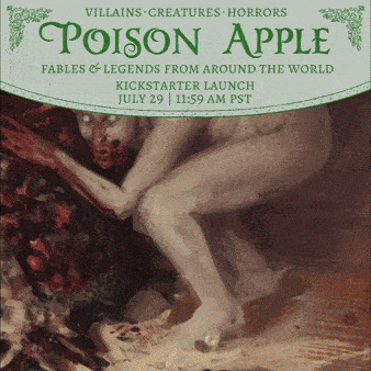 Poison Apple celebrates the stories from fables, fairy tales, and legends with a focus on their villains and creatures. From Alice in Wonderland to Anansi the Trickster, this project strives to feature characters and stories from all across the globe.Poison Apple is a beautiful 200+ page hardcover volume with original art and captivating prose on the villains, creatures, and hidden horrors from fables and legends from around the world.In addition to the book the team of 60 creators also put together a bunch of merch items including a 34 card tarot deck, stickers, prints, charms, pins, and a handful of other goodies that we hope to unlock as stretch goals.